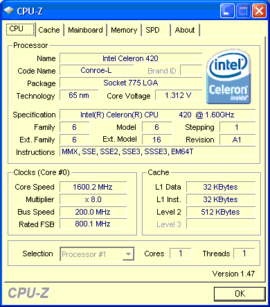 Проц - Celeron 420 (1.6 Conroe-L) - хотел сразу взять ULV какой-нить, но их не было, так что пока взял самый дешевый (единственный дешевле 5тыр в санрайзе на тот момент).