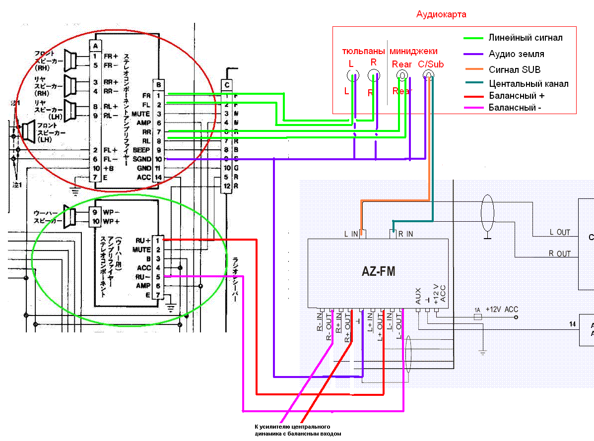 Ты помоему полностью запутался , или я тебя не понимаюЕсли кидать на САБ, то придется выходы L+out и R+out завести на Ru+, L-out и R-out завести на Ru-