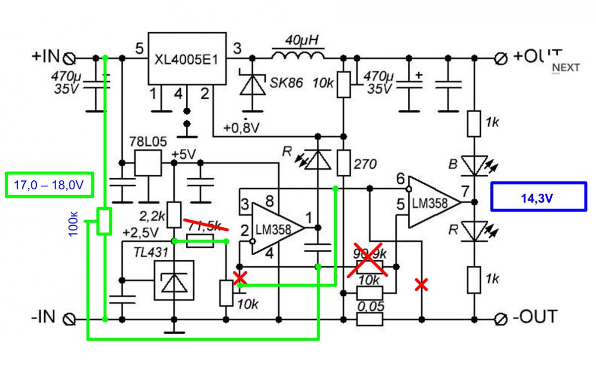 ограничение тока по входному напряжению ниже +17,4V и стабилизация напряжения по выходному напряжению +14,6V:
