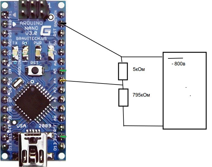 Кривая схема, ардуинка будет светится синим пламенемНужно сделать инвертор с -800 Вольт до +5 Вольт. Варианта два: такая схема через делитель напряжения: https://monosnap.com/file/X4LmbSSh5k...OqaqOsBBbBJc9A