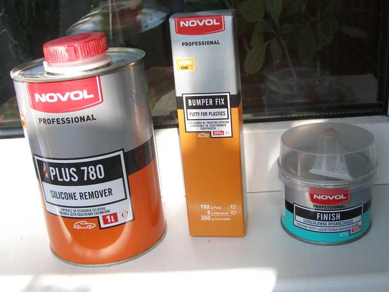 И (слева направо) обезжириватель, шпаклевка по пластику и финишная шпаклевка.