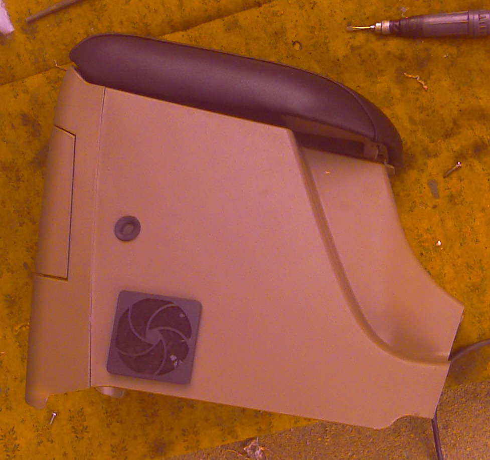 со второй стороны вырезал дырку и поставил такую же декоративную крышку. для выдува воздуха. эффект конечно поразил своей шумностью. теперь подлокотник стал типичным системным блоком. подуйте в 3-х литровую банку, примерно так и будет звучать.