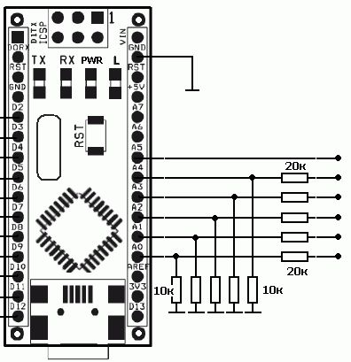 2) Я использую схему с делителями напряжения на аналоговых и цифровых входах как на картинке ,только не 10к и 20к, а 47к и 100к