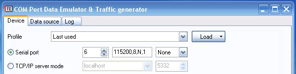 Надо установить 0-модемное соединение между парой виртуальных СОМ-портов ( можно использовать программу com0com ). Данные слать из эмулятора в один порт пары, приложение настроить на второй. Настройки эмулятора такие же как и для сетевой версии, только вместо "TCP" выбрать "Serial port". Как проявляется нестабильность?