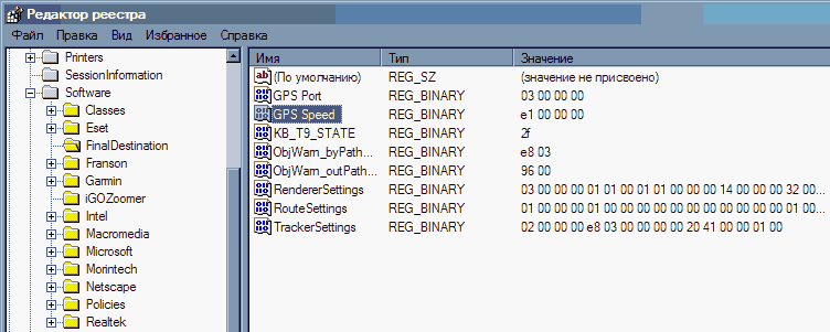 точняк - проверил. руками пишу в реестре e1 00 00 00, запускаю гис, там скорость порта стоит 4800, выбираю 57600, жмакаю поиск, он сбоасывает опять на 4800, захожу потом опять в реестр, а там прописано уже с0 12 00 00