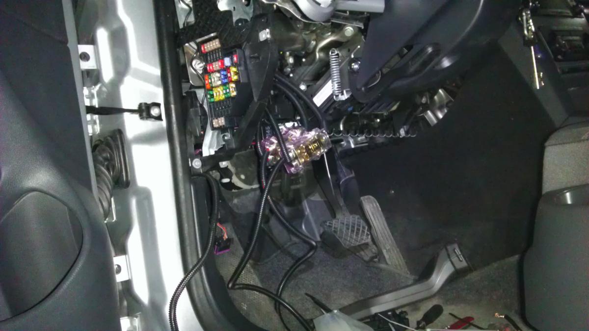 1. Начал с подготовительных работ. Проводка. Нэнавыжююю Ниссан знал как облупленный, салон умел разобрать ну очень быстро. Тут же ВАГовцы постарались на славу, разобрать салон - сплошной гемор. Разводку делал следующим образом. От + и - клемм АКБ идут толстенные провода 4GA ну офигенно качественной и известной конторы под названием mystery Понимаю, что можно было положить лучшего качества, но: 1. в ниссане лежали эти же провода и нареканий в принципе не было, 2. дешевизна и доступность - поехал в русь под боком и купил. На плюсе висит колба со стеклянным предом 60А. Идут они в два дистрибьютера все того же мистери, которые расположились в районе водительской левой ноги около центрального блока электрики. На выходе из дистрибьюутеров идет силовой провод mystery 8GA до усилка и монтажный (или хз как его правильно) кабель в 4 квадрата до компа. Ремоут компа взят с can-шины через родной кабель от кЕтайской магнитолы, заточенной под шкоду. Ремоут усилка взят с блока питания. Абсолютно вся проводка в гофре. Сила протянута по левому боку авто, межблочники и акустика по правому. С акустикой изгаляться не стал - заломало тянуть провода в каждую дверь. Нарастил свои провода на штатные провода колонок через все туже кЕтайскую колодку.