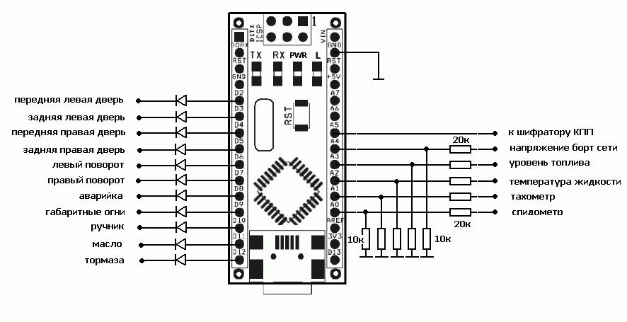 Схема подключения. При не правильном подключении диодов вы рискуете спалить устройств. По приведенной схеме катоды диодов подключаются к соответствующим индикаторам(лампочкам) со стороны управляющего сигнала. В случаи если индикатор управляется минусом , то в скетче придется проинвертировать соответствующий сигнал.