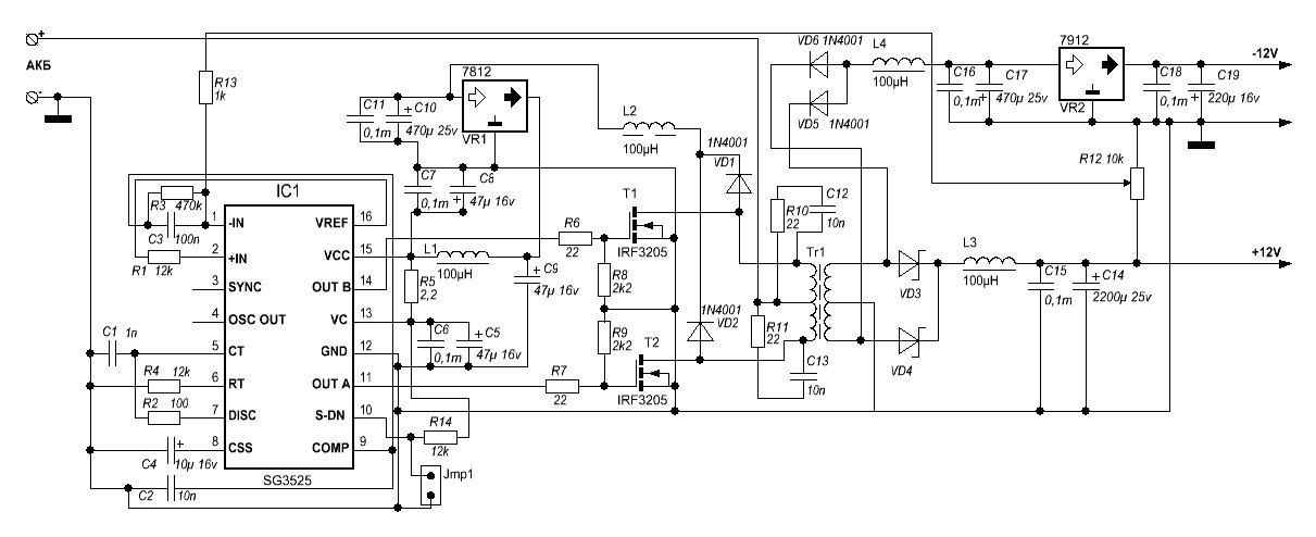Если огромный ток по +12В не нужен, а нужно сделать всё проще - то можно слепить такую штуку. Поскольку она трансформаторная - то может быть как понижающей, так и повышающей (что дл 12В канала и требуется). Если на трансформатор повесить ещё обмоток - то можно снять и другие напруги, например - отрицательные. Вроде как проще уже некуда. Трансформатор - придётся наматывать НЕ на ферритовом кольце - а то оно насыщается, транзистор начинает дымиться. Пробовал намотать на кольце из пресспермаллоя (от дросселя групповой стабилизации АТ БП), с ним - транзистор практически не греется. Думаю - вполне можно использовать Ш-образный сердечник с зазором, или даже вообще - ферритовую "гантелю". Вечером проведу испытания.
