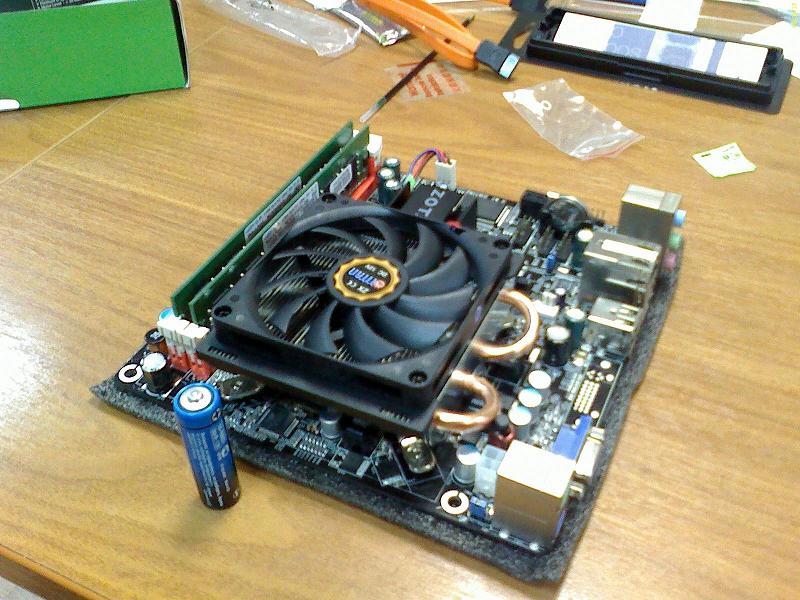 Материнка zotac 610i-ITX+ кулер Titan NK45TZ высота 45мм как у пальчиковой батарейки, причем поток воздуха выходя из радиатора процессора проходит сквозь радиатор чипсета.