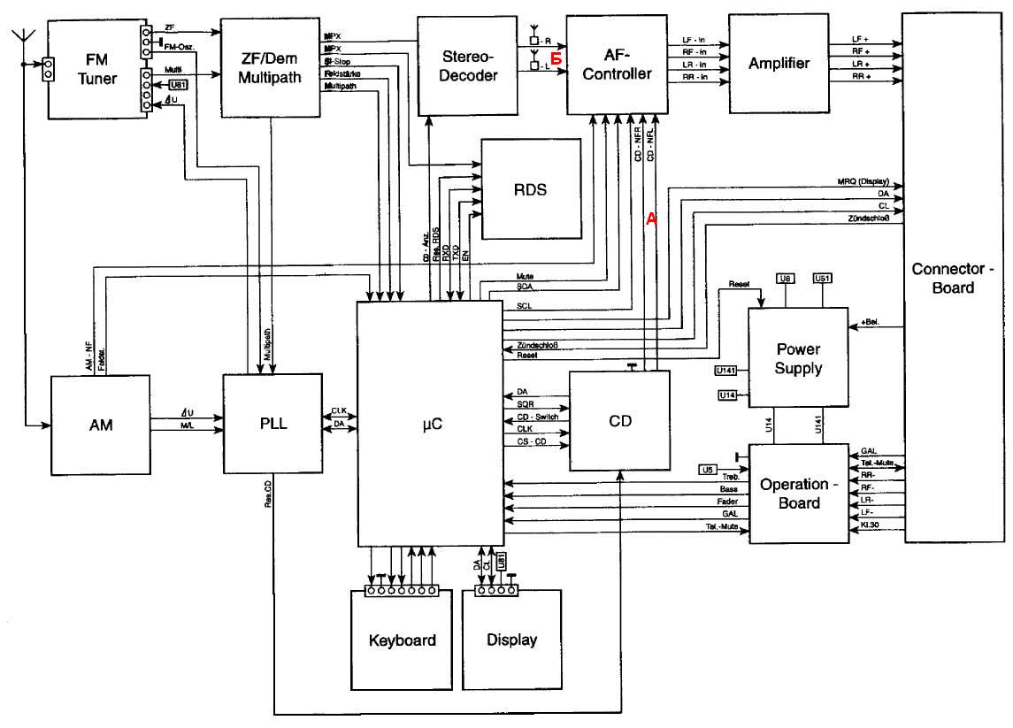 Всем доброго времени суток! Прошу вас помочь активировать аух на автомобиле Опель. Аух завести хочу через миниджек. Посмотрев схему нашел 2 варианта А и Б (см. схему). При подключеии по варианту (А) звук разрывается от сд привода при подключении внешнего устройства и тем самым активируется АУХ. Но такой вариант не самый корректный т.к. при подключении АУХ сд привод (как мне кажется) продолжает работать, можно конечно вытащить диск, но...... вы понимаете. Вариант (Б) тоже имеет звуковые входы, только что будет отключаться не совсем понимаю? Радио?. Еще как вариант хочу рассмотреть подключение через канал АМ диапазона, но куда подключить не пойму. Может подскажет кто пальчиком??? Спасибо.