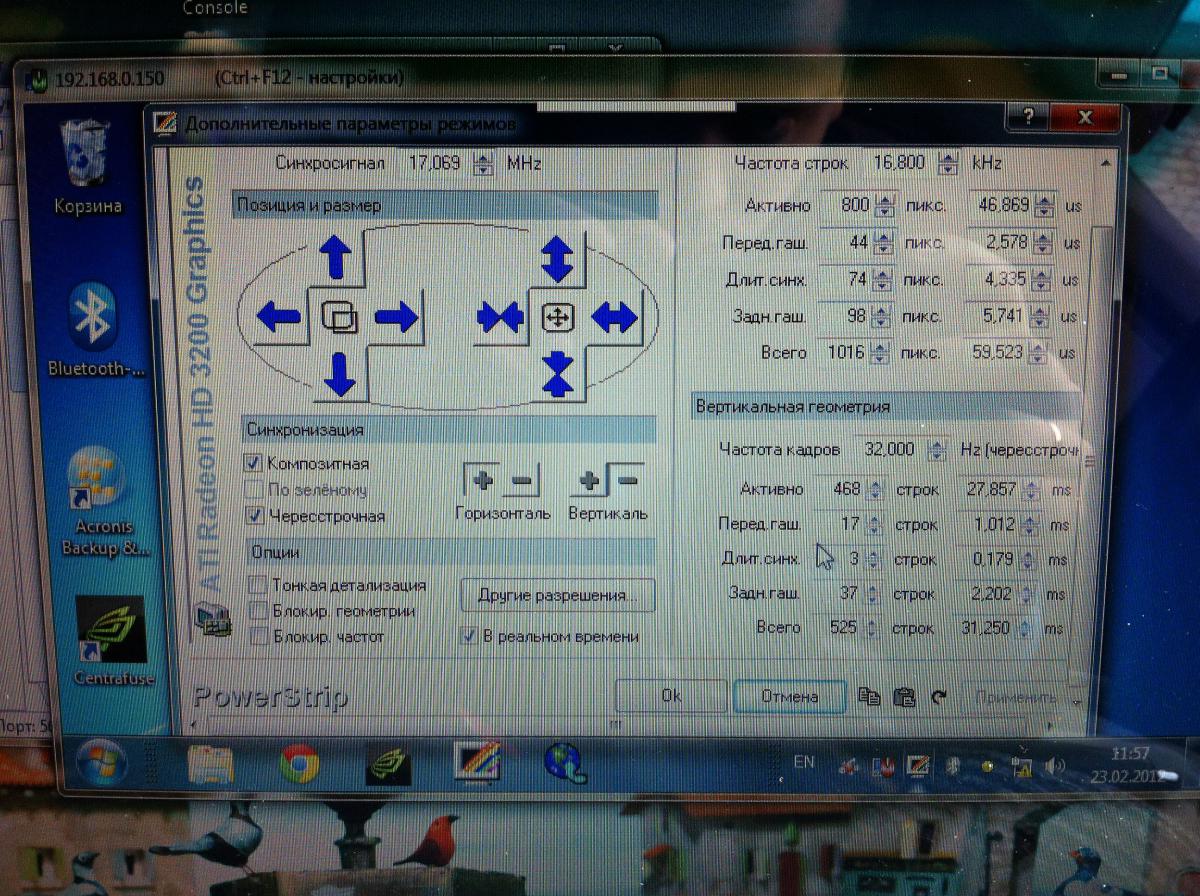 В опциях драйвера ATi включил композитную синхру, но так и не могу получить нормальную картинку, ибо не знаю, какие именно параметры прописать в пользовательском режиме Soft15khz, подобрать их с помощью PS не могу.