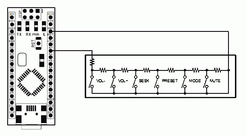 3-Теперь для подключения аналоговых датчиков, можно использовать вход A7 Arduino , на этом входе мы поставили резистор смешения подтянутый к +5в. Теперь для превращения ардуино в адаптер рулевых кнопок, не нужно ничего паять кроме двух проводов