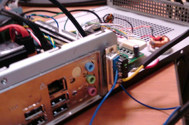 особо хочу отметить дополнительные разъемы, типа питание, avc-lan, асс и т.п. так вот, места для них практически нет. я смог придумать только размещение 15-контактного разъема типа D-SUB. 4 контакта на дифференциальный звук, 2 -- авц-лан, 1 -- асс, питание и земля -- по 4 контакта. изначально был не очень уверен в этих 4 контактах на 4 ампера, да че там говорить, и сейчас не сильно уверен, нужно последить, но прогоны на столе показали, что соединение стабильно, ниче не греется. из минусов: не хватило контактов для вывода +5 для питания юсб-хаба, возьму с внешнего +5/+12/GND разъема, который для внешних дисков. еще не хватило вывода для внешнего выключения питания, он перейдет на заднюю планку.