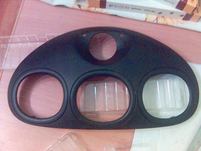 поставь моник вместо воздуховодов , слепи формочку типа такой , что у тебя панель приборов накрывает (то есть что бы полукругом как раз входила в ту "прорезь" , что у тебя вокруг воздуховодов)