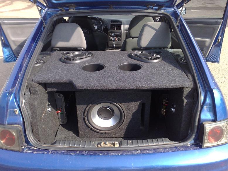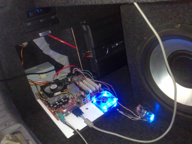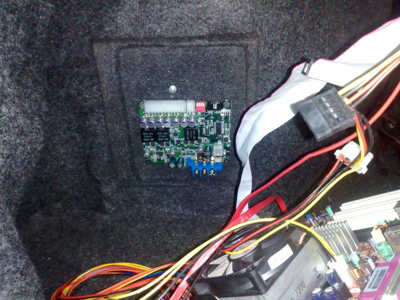 Блок питания М4-АТХ на задней части крыла(включает и выключает от зажигания монитор, хаб и три усилителя(два четырехканальных фронт-тыл и двухканальный на саб), на фанерке.
