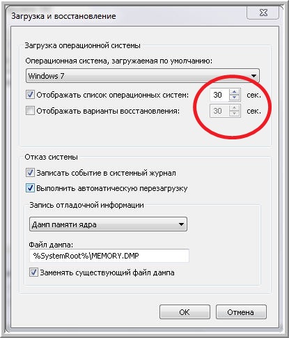 Не знаю как в 7-ке. а в ХР - панель управления - Система - вкладка "дополнительно" - Загрузка и восстановление - кнопка "параметры".